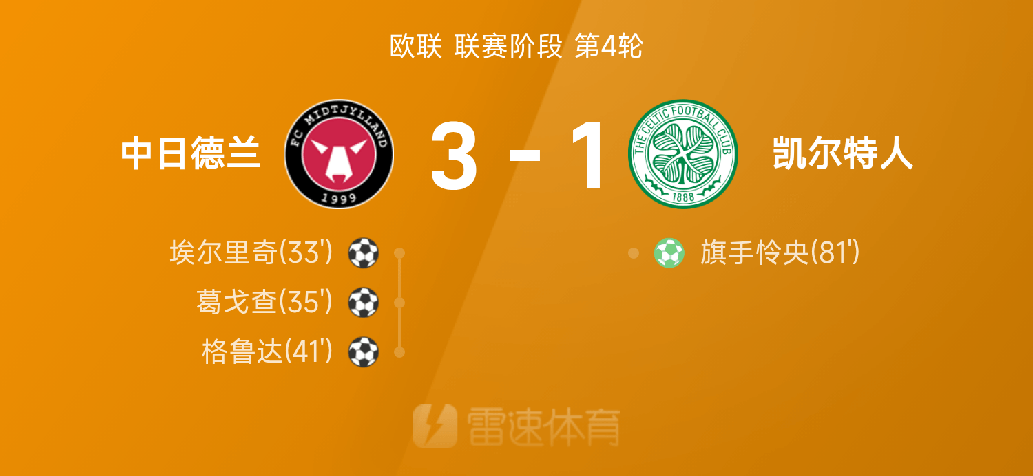 6686体育官网11月07日讯 25/26赛季欧联联赛事阶段第4轮,中日德兰3-1战胜凯尔特人。全场竞赛,葛戈查发挥出色贡献1射1传,格鲁达、埃尔里奇破门建功,旗手怜央破门难救主。