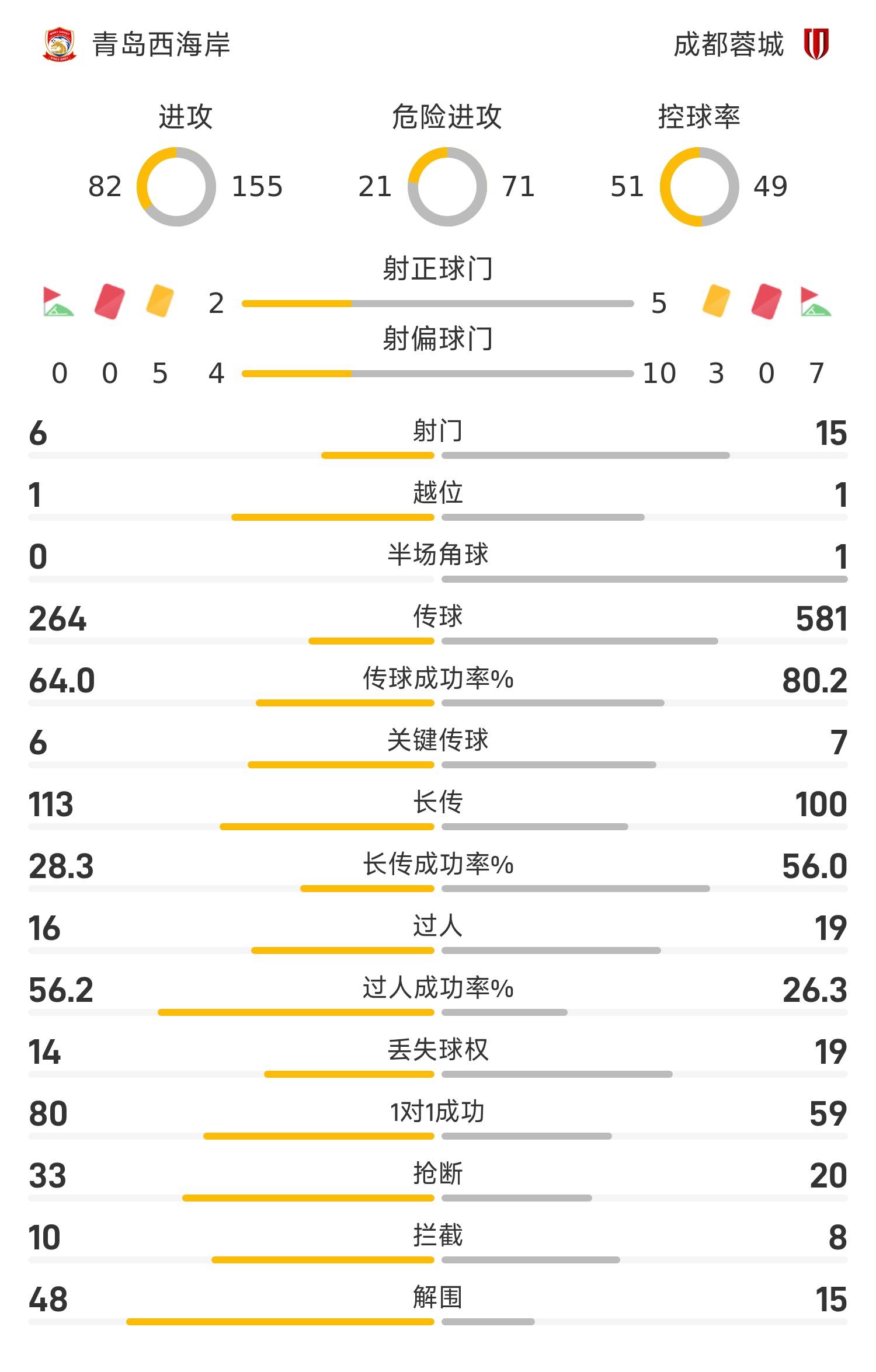 青岛西海岸首发阵容:1-李昊、5-里切利、22-杨希、17-陈柏良(73’8-张修维)、24-段刘愚(86’14-冯刚)、20-何龙海(41’13-宋浩宇)、6-徐彬、23-马特乌斯、11-戴维森、10-内尔松(86’68-方海洋)、9-阿齐兹