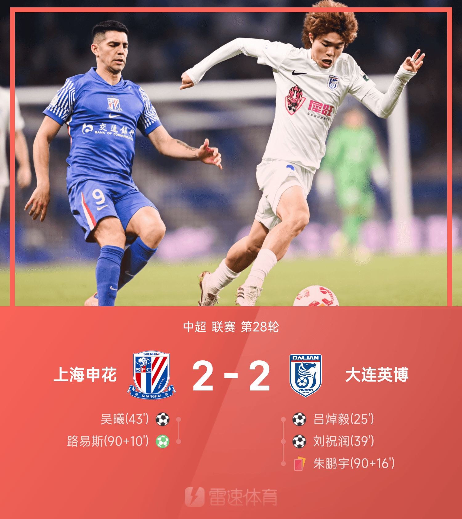 中超战报:吴曦建功+造点、路易斯补时绝平,申花2-2英博