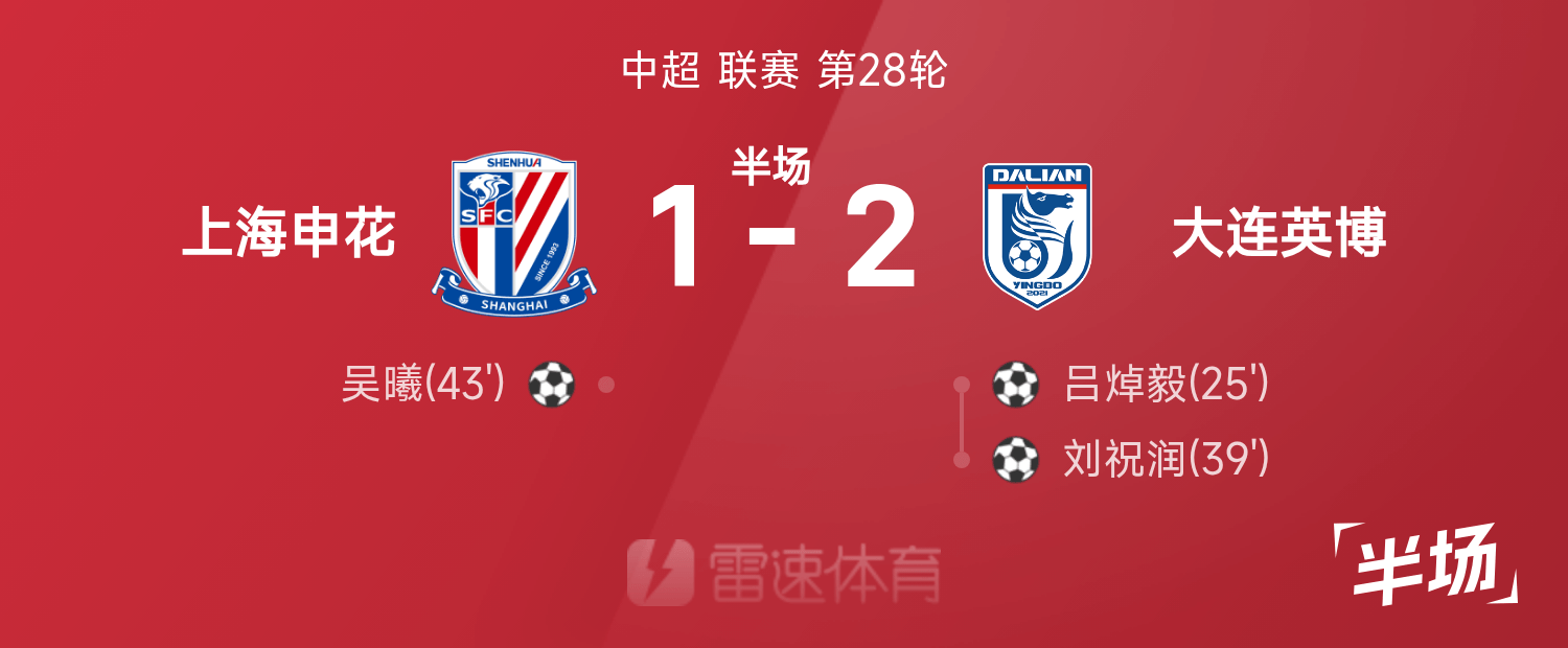 中超半场:吕焯毅世界波、刘祝润建功,申花暂1-2英博
