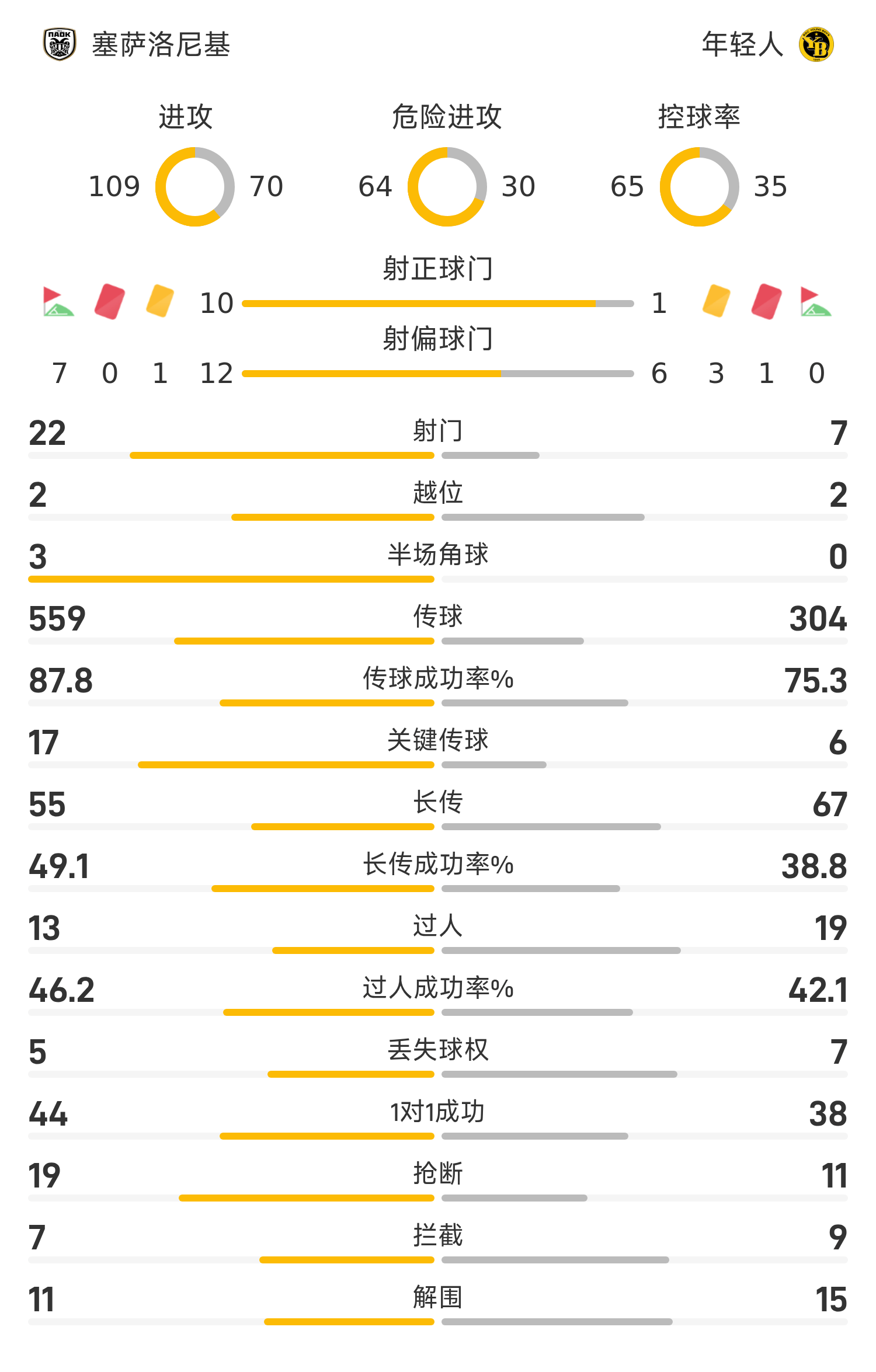 塞萨洛尼基首发阵容:99-特斯菲斯、21-巴巴、3-肯尼、4-沃格里亚科、5-米凯利迪斯、11-弗雷达(79’18-伊万努舍茨)、8-梅特、77-德斯波多夫(62’14-日夫科维奇)、22-比安科(66’27-奥兹多夫)、65-康斯坦泰利亚斯(79’10-佩尔卡斯)、7-贾库马基斯(79’9-查路夫)