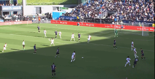 26’奥克兰守门员及时出击,将对手单刀奋力扑出拯救球队