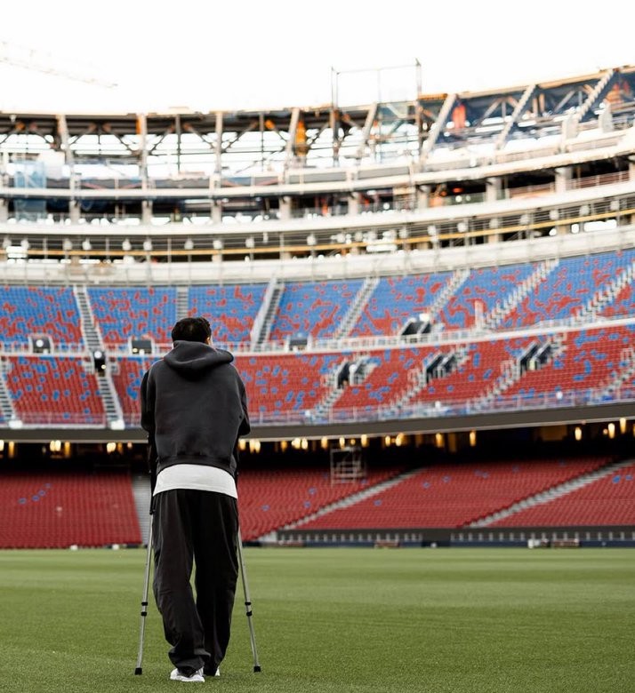 随后,加维在社交媒体上分享了一张自己拄着拐杖踏入诺坎普的照片。