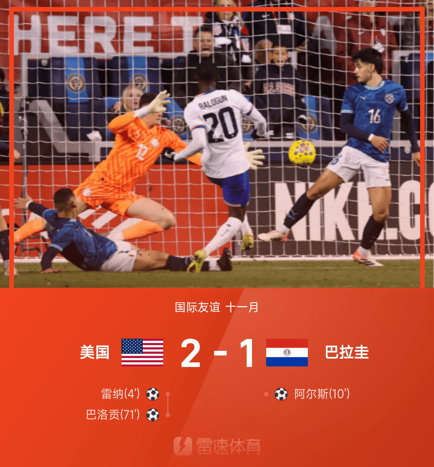 6686体育官网11月16日讯 国际友谊赛迎来一场对决,美国主队场对阵巴拉圭。美国队方面,巴洛贡、雷纳分别破门建功,而巴拉圭方面阿尔斯破门难救主,最终美国2-1击败巴拉圭。