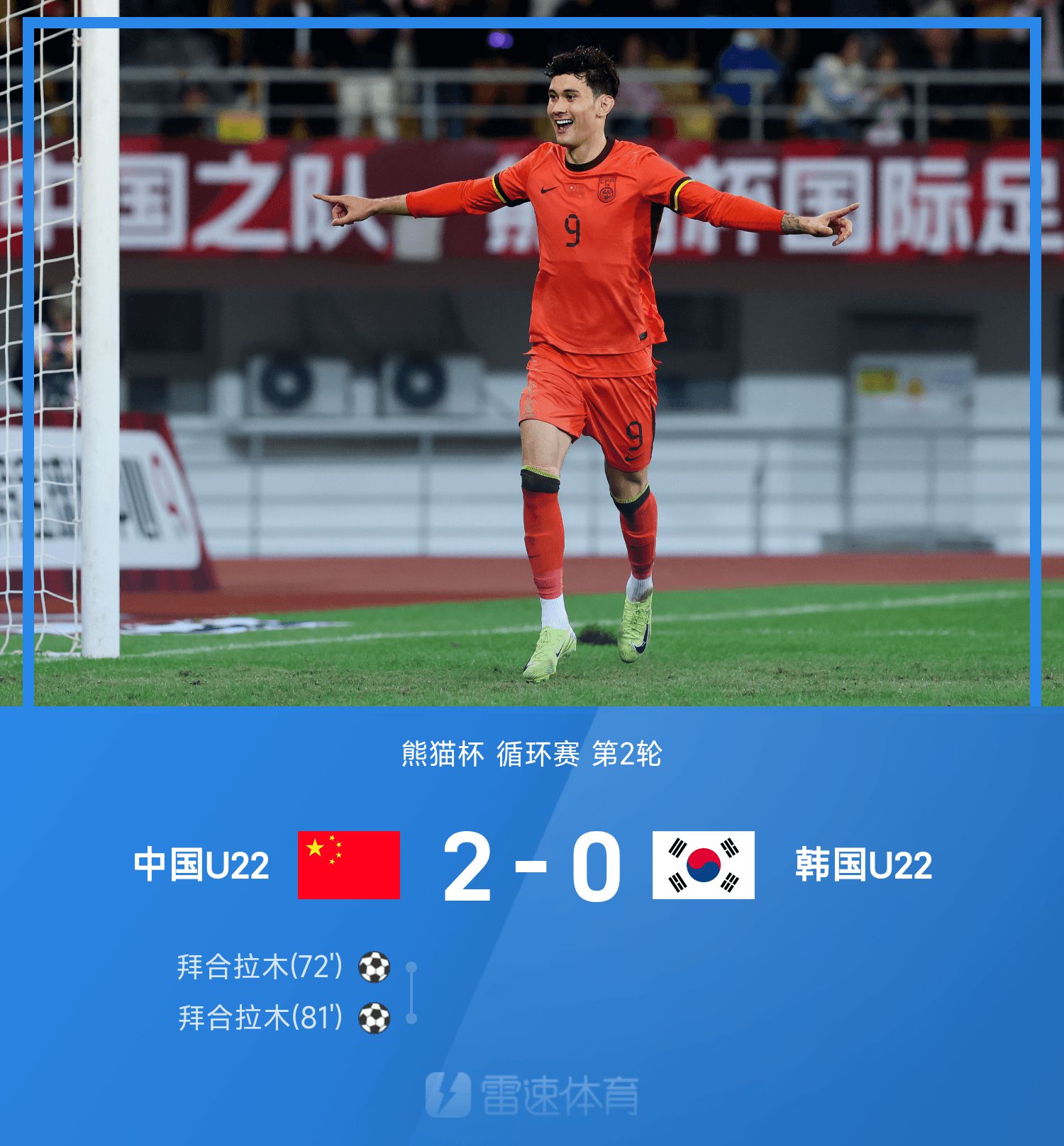 6686体育官网11月15日讯 25赛季熊猫杯循环赛第2轮,中国U22对阵韩国U22。上半场,徐彬倒脚差错险些送礼,金容鹤错失良机;下半场,李镇全进球被吹越位在先,拜合拉木先是低射打破僵局,随后又脚后跟破门完成梅开二度。最终,中国U22 2-0完胜韩国U22。