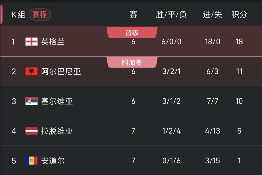 英格兰已提前锁定小组头名出线。阿尔巴尼亚和塞尔维亚将争夺小组第二。