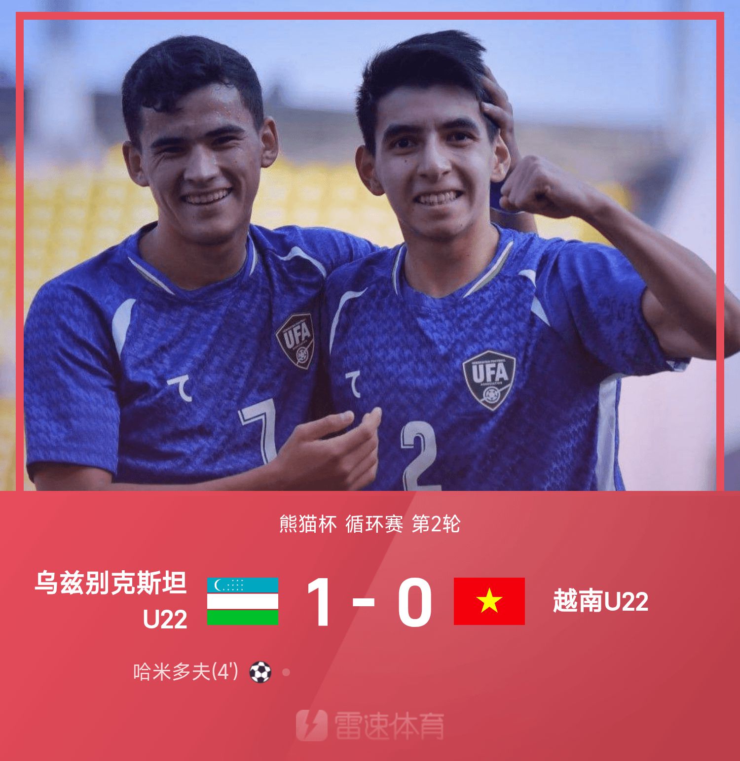 6686体育官网11月15日讯 25赛季熊猫杯循环赛第2轮,乌兹别克斯坦U22以1-0战胜越南U22。全场竞赛,哈米多夫破门建功。目前熊猫杯参赛球队仅中国U22未获得胜出局,国青首场0-1不敌越南,今晚19:35将迎来韩国国青的挑战。