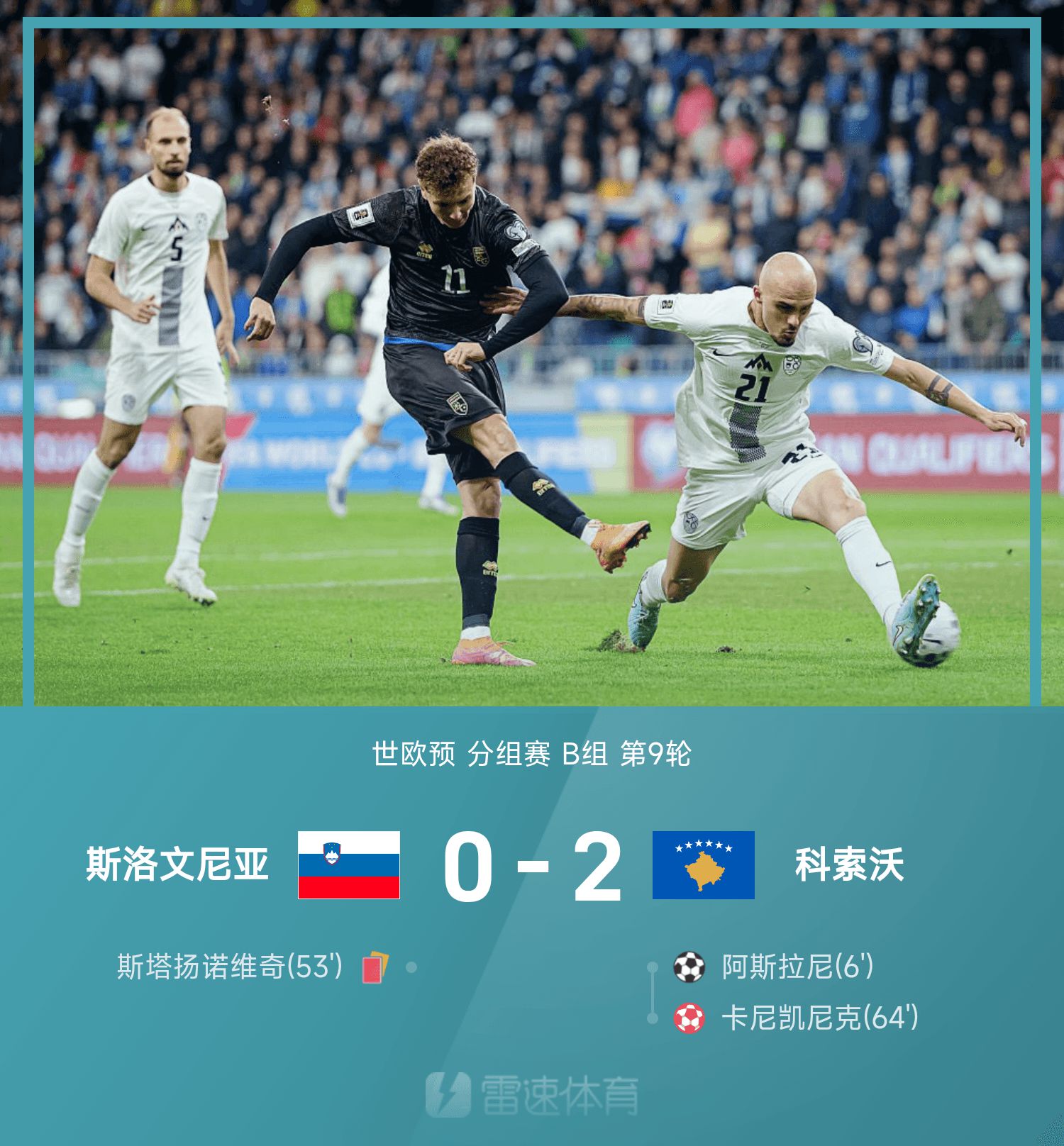 6686体育官网11月16日讯 26赛季世欧预分组赛B组第9轮,科索沃2-0战胜斯洛文尼亚。全场竞赛,阿斯拉尼三秒区内戏耍对手破门,卡尼凯尼克打入乌龙球世界波,斯塔扬诺维奇后备队员登场连吃两黄被罚下,奥布拉克屡献神扑难救主。