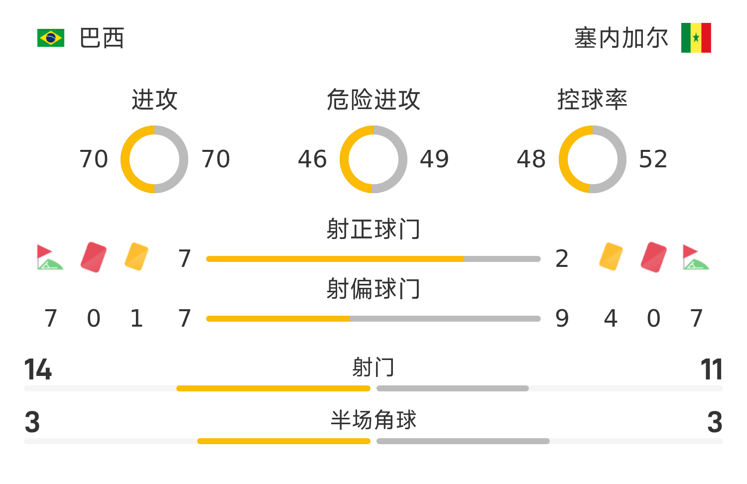 巴西首发阵容:23-埃德森、6-桑德罗(90’15-布鲁诺)、4-马尔基尼奥斯、2-米利唐、3-加布里埃尔(64’14-韦斯利)、5-卡塞米罗、8-吉马良斯、7-维尼修斯(90’16-恩里克)、21-库尼亚(65’22-佩德罗)、10-罗德里戈(83’11-帕奎塔)、20-埃斯特旺(83’19-恩里克)