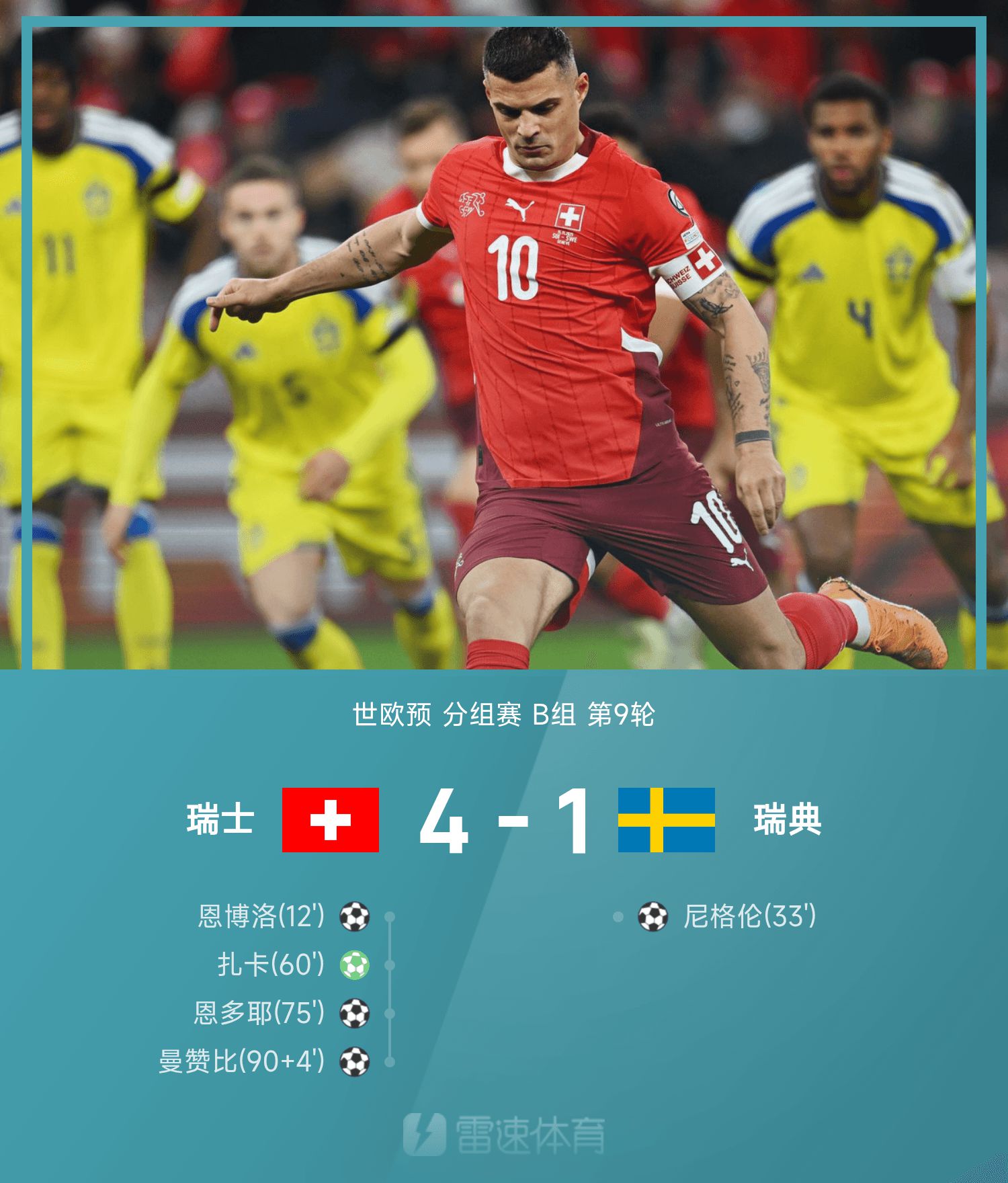 世欧预战报:恩多耶传射,扎卡点射,瑞士4-1大胜瑞典