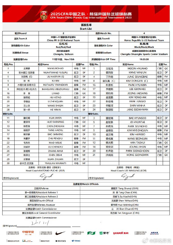 6686体育官网11月15日讯 北京时间今日,熊猫杯第二轮,国足U22对阵韩国U22,赛前双方公布首发。