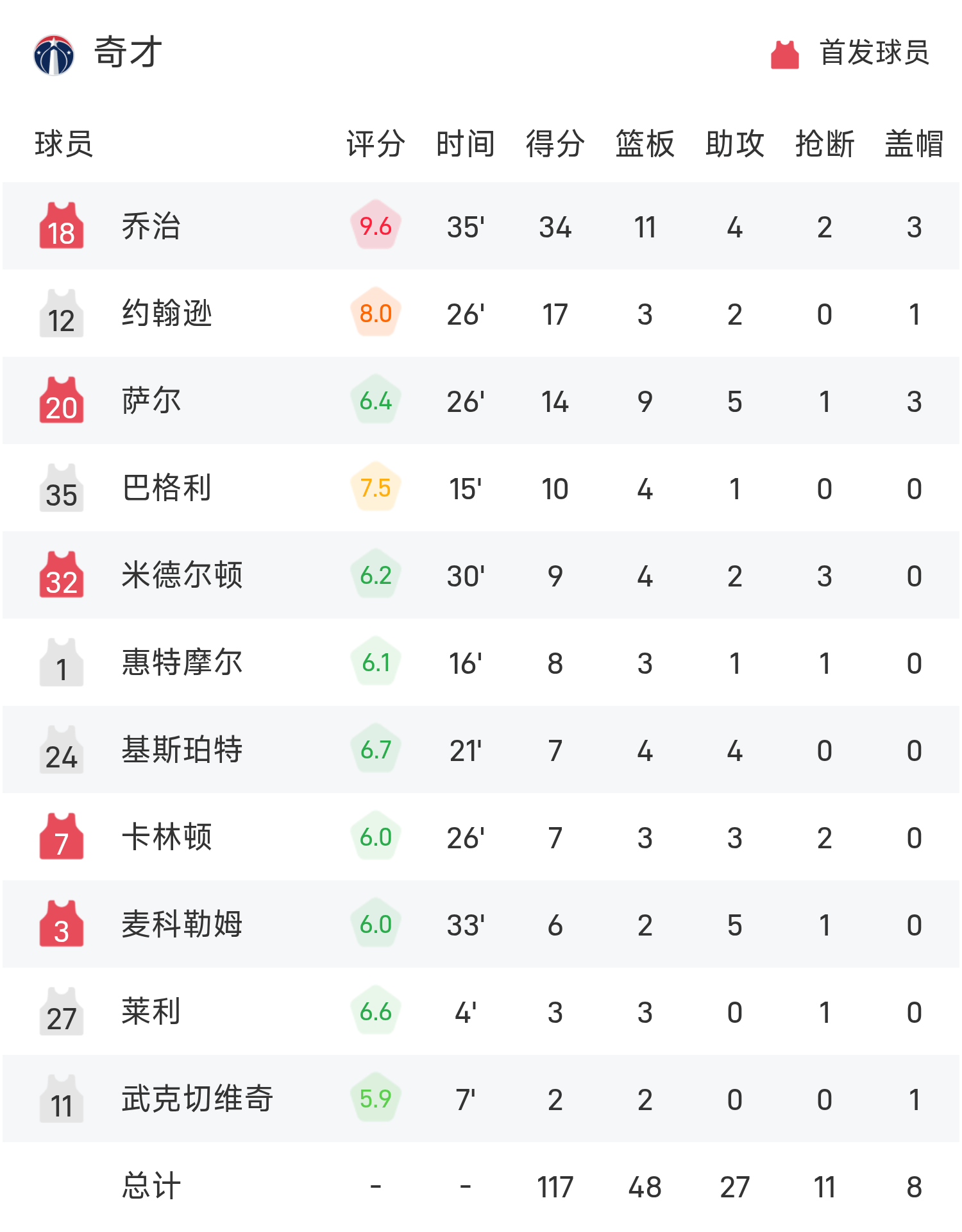 6686体育官网10月25日讯 25/26赛季NBA 常规赛,独行侠对阵奇才。双方全场战罢,独行侠107-117不敌奇才。乔治砍下全场最高的34分11板4助,率领奇才胜利取胜。