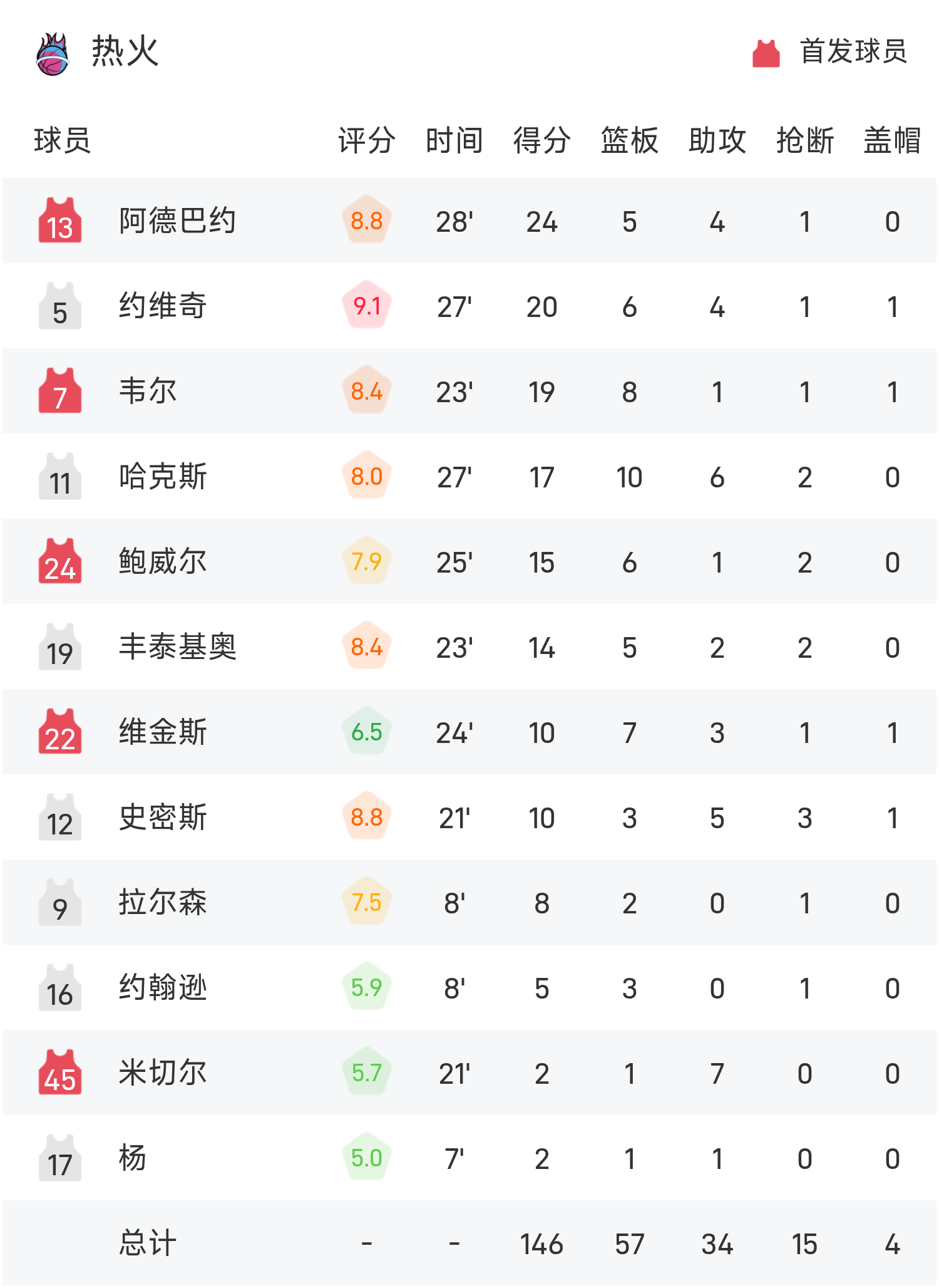 6686体育官网10月25日讯 25/26赛季NBA 常规赛,灰熊对阵热火。双方全场战罢,灰熊114-146不敌热火。阿德巴约砍下全场最高的24分5板4助,率领热火胜利取胜。