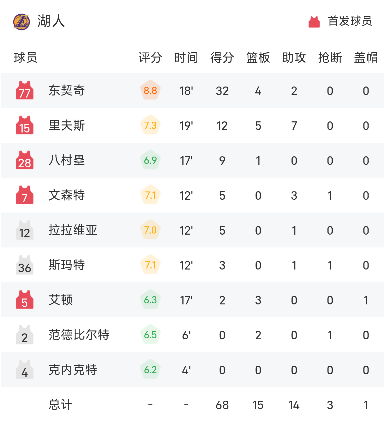 NBA半场:东契奇爆轰32分,湖人68-63领跑位森林狼