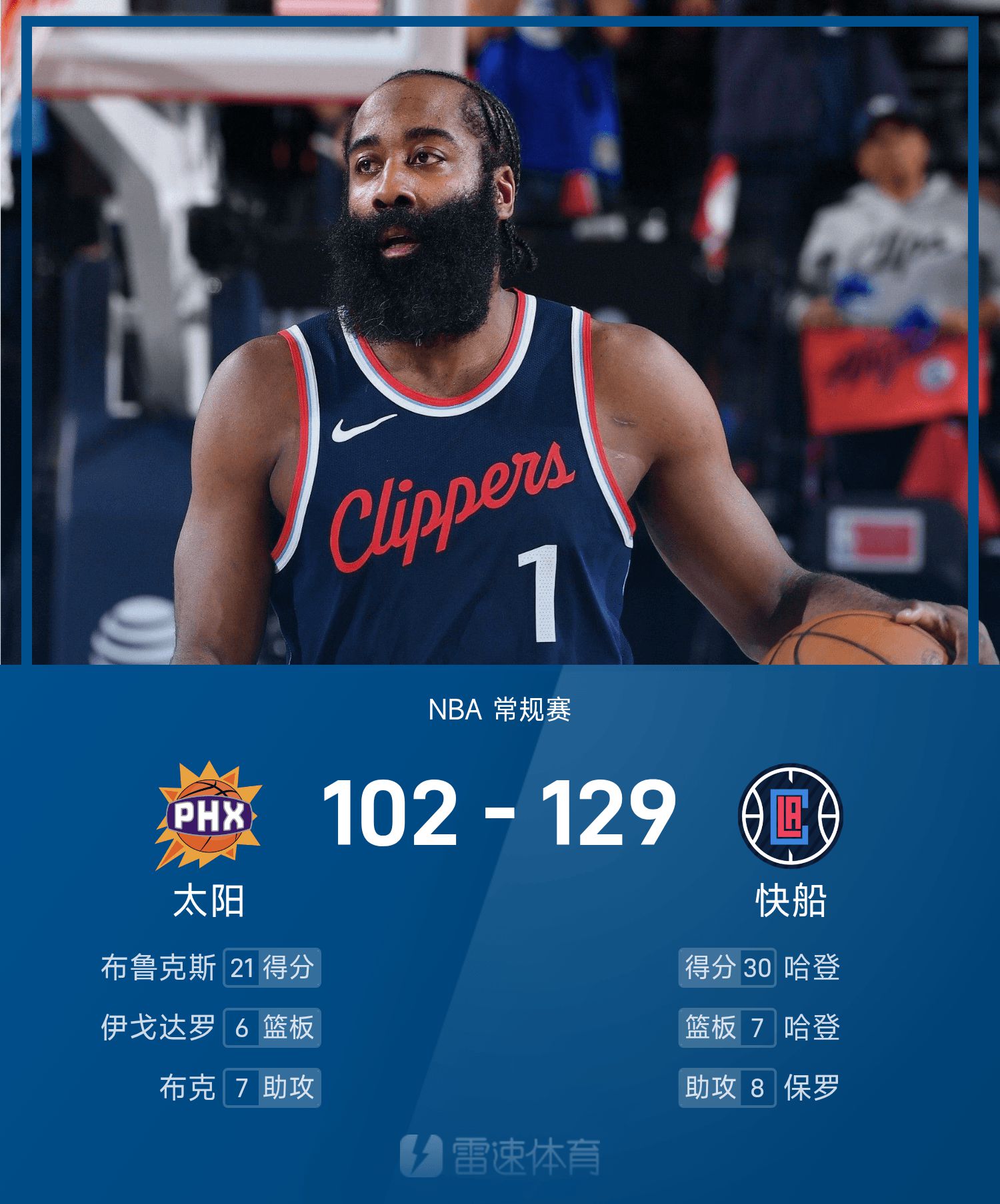 哈登12投8中,得到30分7抢篮板7助攻。