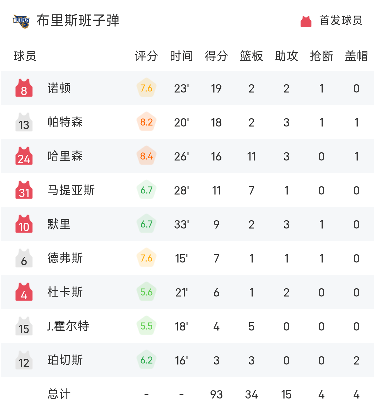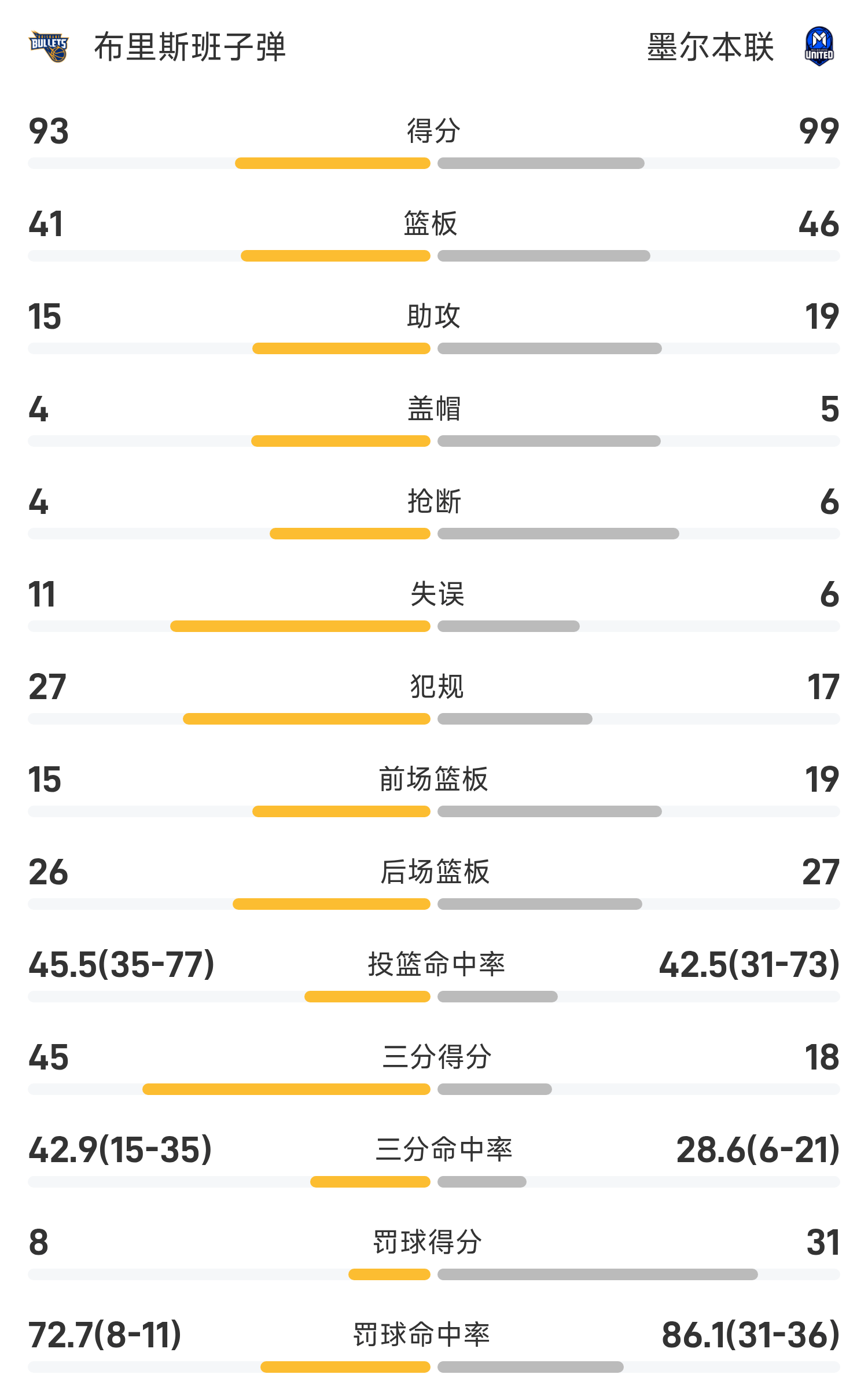 双方全场战罢,墨尔本联99-93战胜布里斯班子弹。