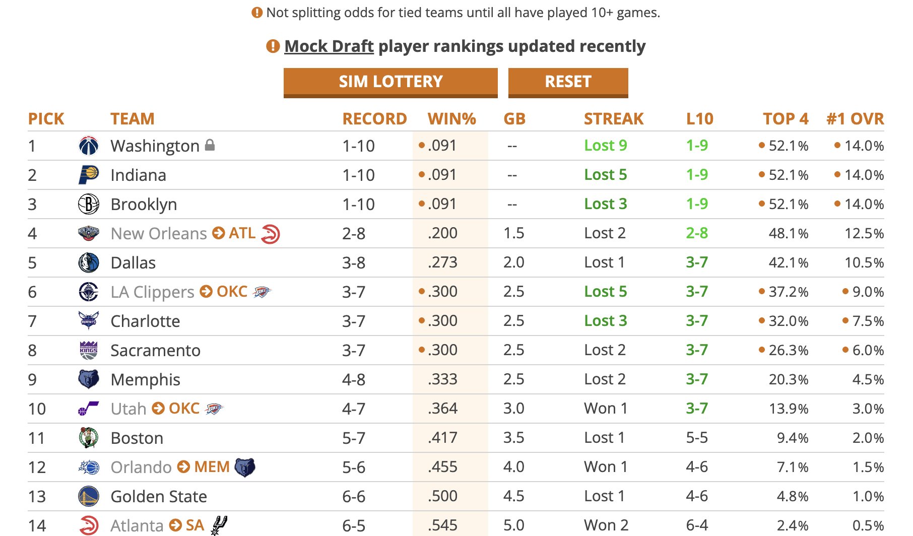 6686体育官网11月12日讯 美媒Tankathon根据当前联盟各队的战绩,今日更新了2026年选秀抽签的概率,奇才、步行者、篮网三队由于战绩都是1胜10负,抽到状元签的概率都是14%,抽到前四顺位的概率为52.1%。