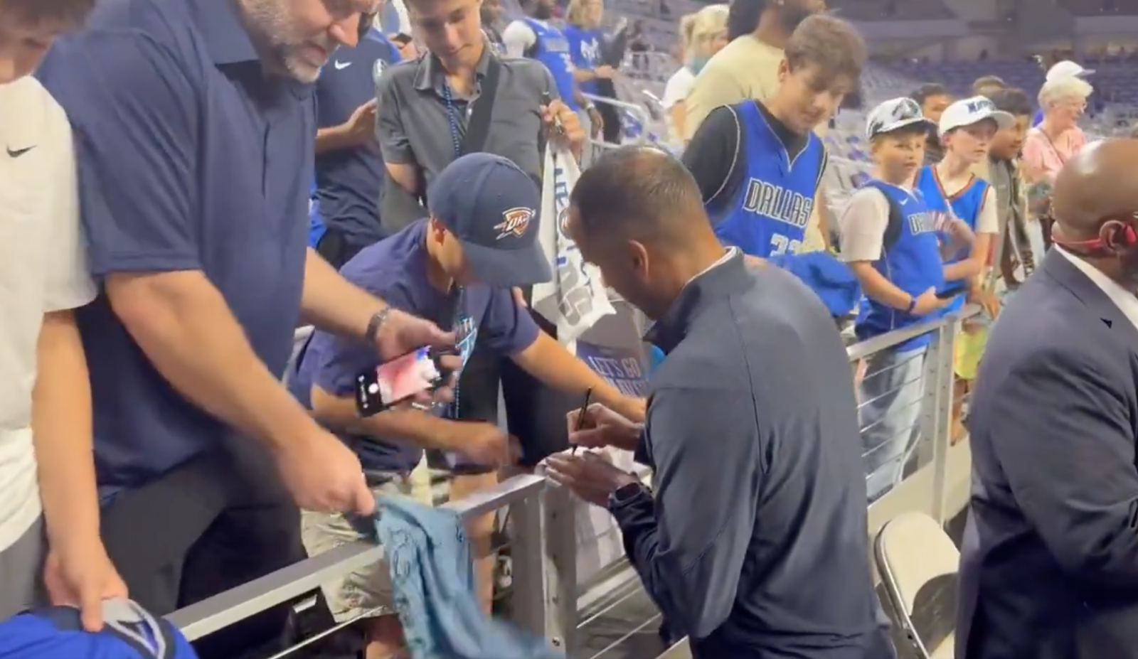 哈里森为独行侠球迷签字合影,故意跳过身穿东契奇队服的球迷